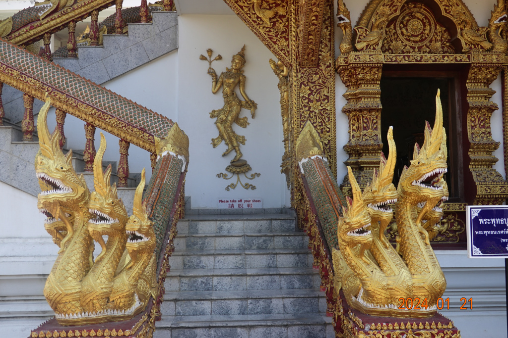 The shrine & ho trai structure is elaborately decorated and the stairs are guarded by 5-headed Naga serpents and a dancing thewada on the wall at the first landing.