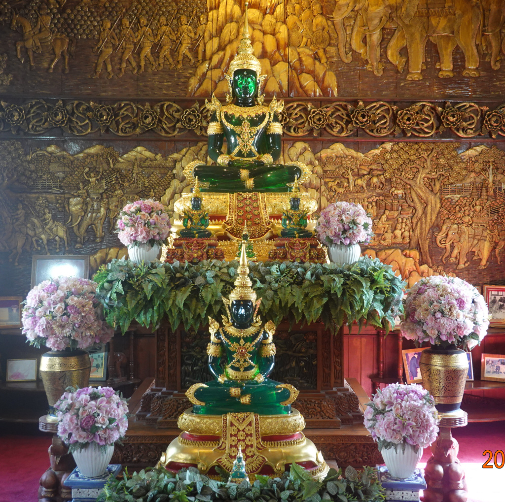 On the left is a replica of the “Emerald Buddha” which is in Bangkok at Wat Phra Kaew in the Grand Palace. On the right is the large teak Buddha – in this photo I am there as well, almost smiling as I try to get both me and the Buddha in the photo.