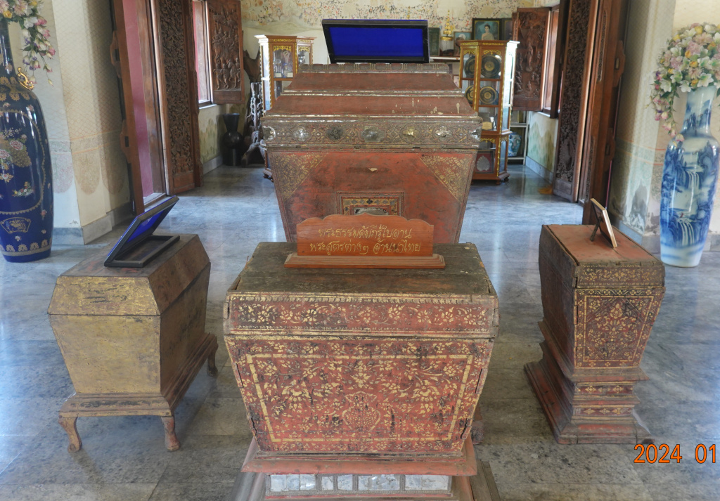 Upstairs in the shrine, the appearance is much like a viharn, but with an alcove on the right for the large teak Buddha and an alcove on the left for two emerald-colored Buddha statues.