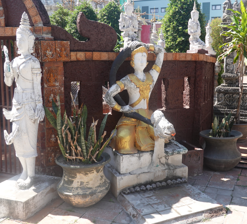 As is common at Buddhist temples, they honor Mother Earth with a statue of Phra Mae Thorani. The Mother Earth statue at Wat Buppharam is in need of restoration or at least a cleaning. This may come because there is much restoration work in progress: the chedi is undergoing a massive restoration and the outside walls are being rebuilt.