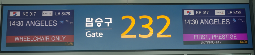 I made my way to Gate 232 (the same gate as last year for this same flight) for the 11-hour flight from Incheon to Los Angeles. The”LOS” is missing from the signs below because it is a moving display and I snapped the photo just as LOS disappeared.