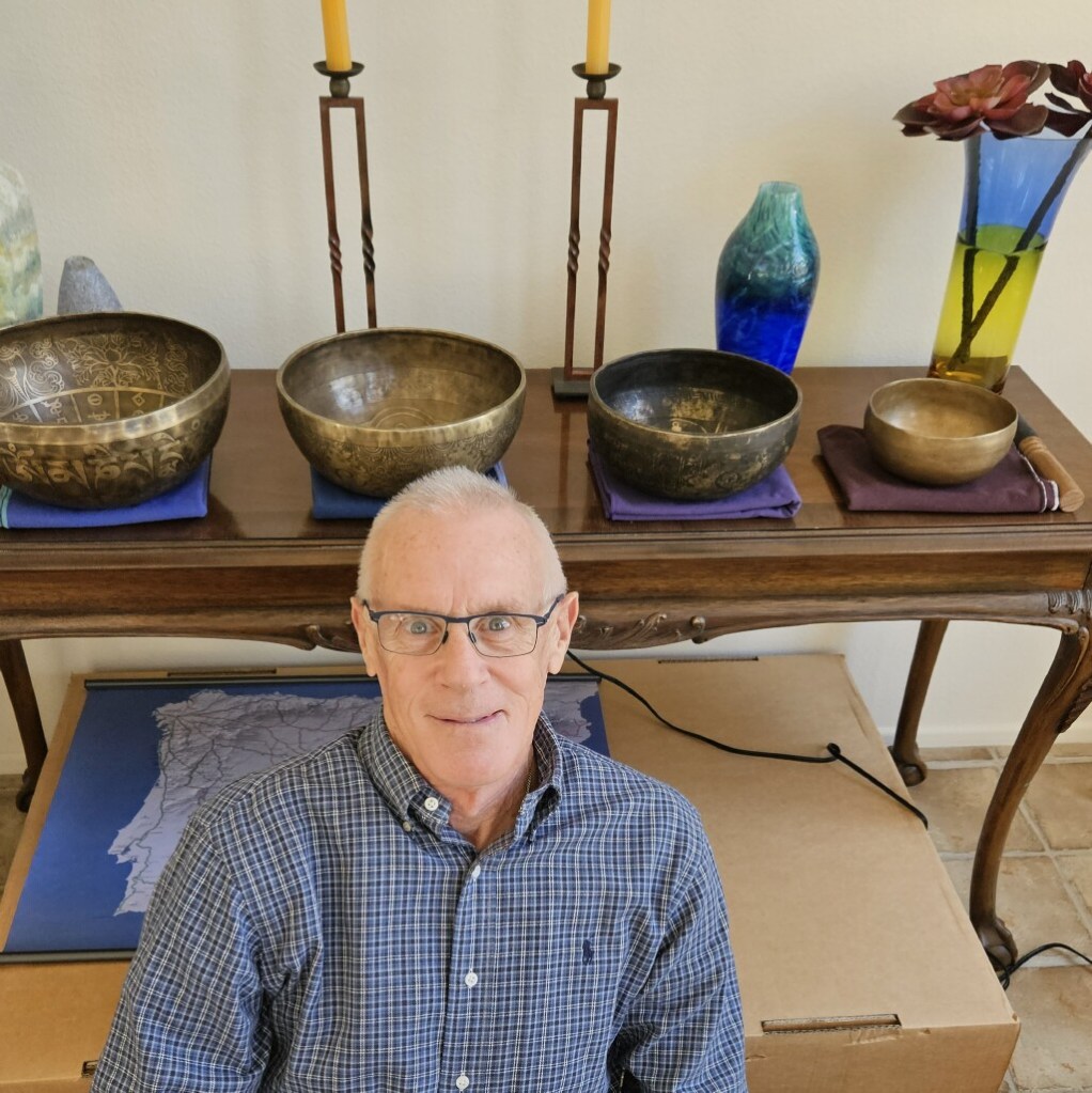 Here I am in my house sitting in front of some of the singing bowls I purchased several years ago from The Singing Bowl Center in Chiang Mai. This is where I sit for my daily meditation.
