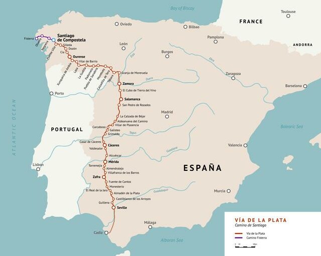 The Via de la Plata goes from Seville to Astorga, and once there, pilgrims can follow the Camino Frances to Santiago de Compostela making for a total walk of 1200 kilometers or over 740 miles. Alternatively, pilgrims can turn left at Granja de Moreruela just after Zamora to travel roughly northwest to Santiago de Compostela along a Camino route called the Camino Sanabres. Following the Via de la Plata from Seville then the Camino Sanabres to Santiago de Compostela is a 1000-kilometer walk (620 miles). Here is a diagram of the Via de la Plata / Camino Sanabres route: