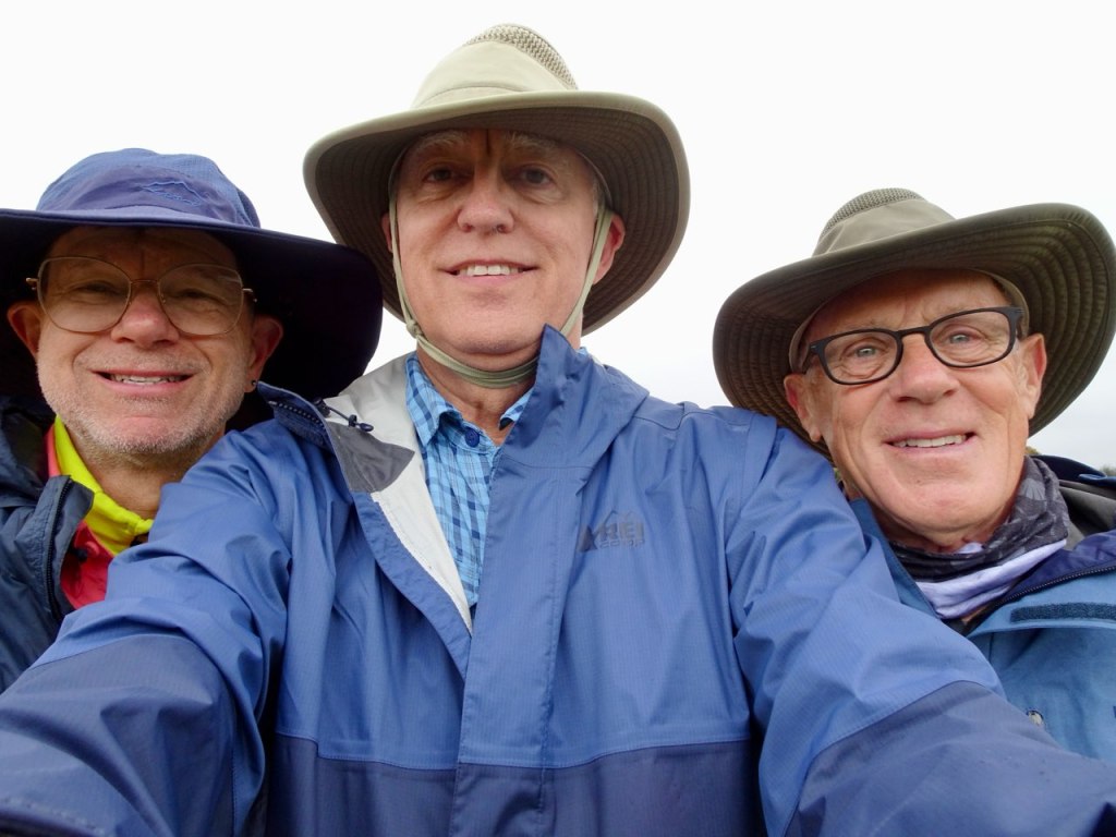 We came to a split in the path. The Wise Pilgrim app shows both options are the same distance, but one goes through a town with a bar, so we chose that one hoping to get a café con leche there. But before we continued, we took a break to take off our packs, have a granola bar, and drink some water. We took a group selfie and Ron got a photo of Dan and me with our backpacks off. We were not sitting down because the ground was wet from the intermittent rain.