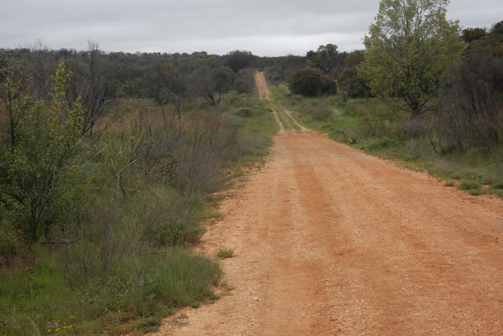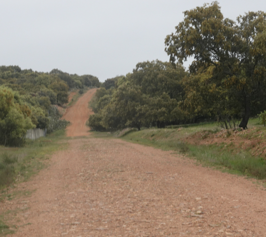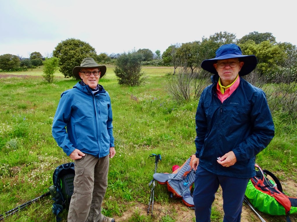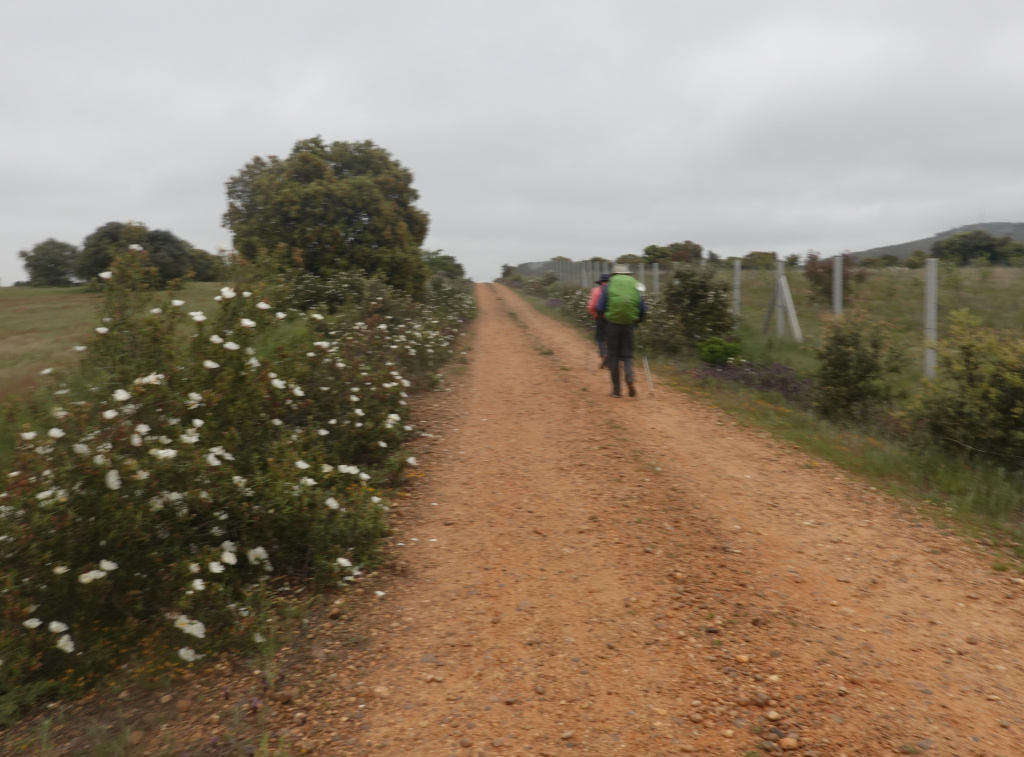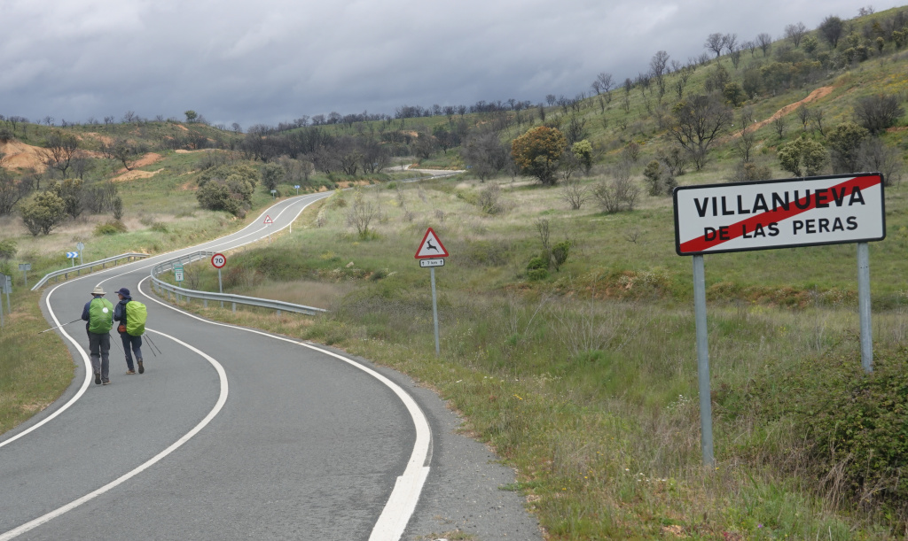 We left Villanueva de las Peras, and the threatening rain had materialized, but lightly. The bright green pack covers should make us visible on a gloomy day. Much of the rest of today’s walk is along a secondary, lightly traveled highway.