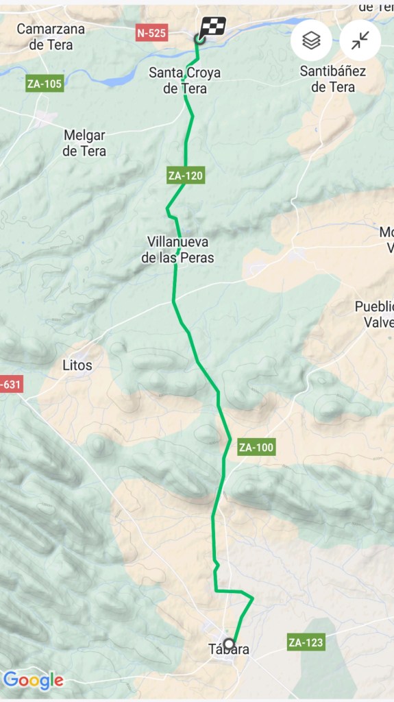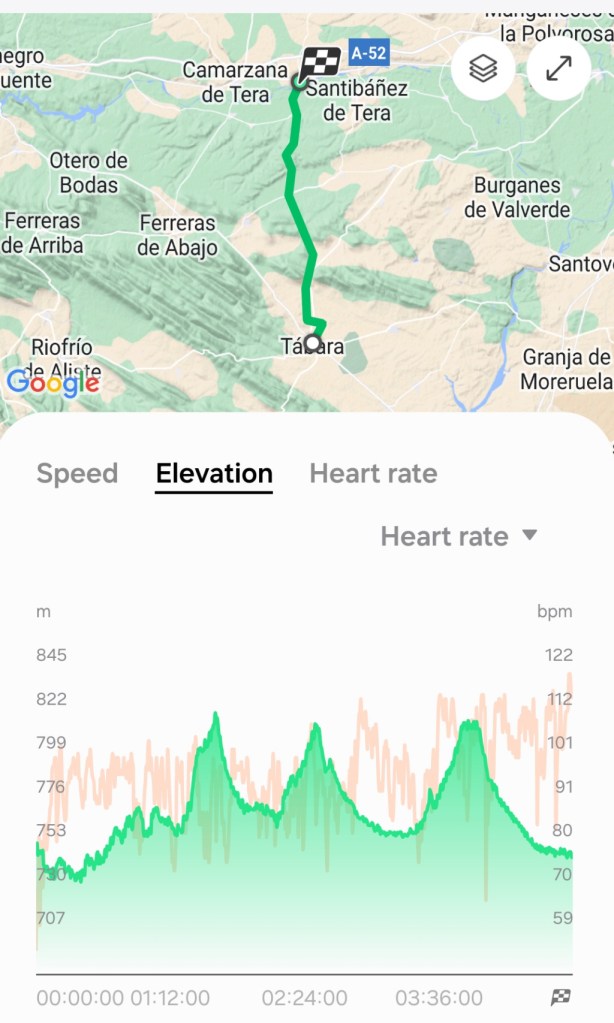 The route today was almost directly north from Tábera to Santa Marta de Tera. From the elevation graph, there were three long and slightly steep uphill sections. The good thing about the uphill walks is that at the top, there is often a good view and after the top, there is a downhill section.