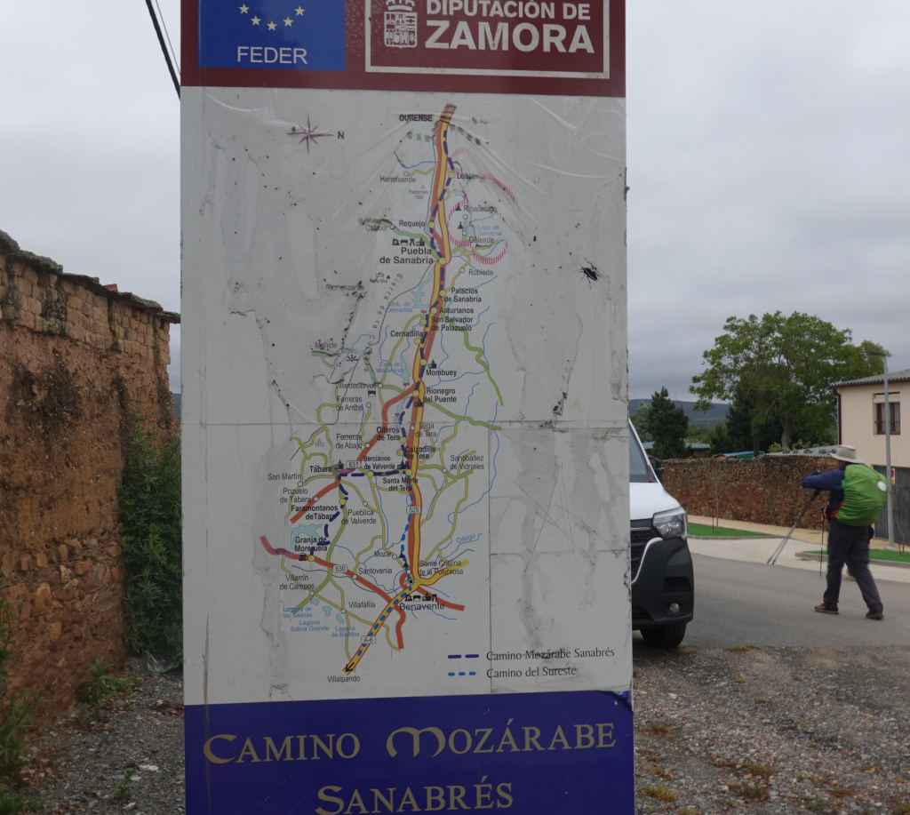 After the typical breakfast of café con leche, toast, and jam, we got out the door and on the road by 8:30 this morning. At the edge of Tábera, we saw a large map of the Camino in the area on a sign, about 2 meters high.