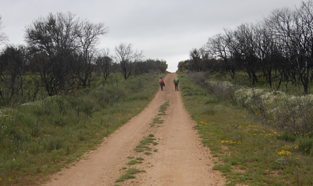 Today’s walk was characterized by two things. First, it was cool today, but not quite as cold as the previous days. Today was heavily overcast, windy, and threatening rain most of the day. for the last couple of hours, there was an almost continual light rain. We are hoping the wind will blow the clouds away tonight. Second, for at least a couple of hours, we were walking through areas of burnt trees and former orchards where there had been very expansive fires in 2022. A very sobering view. The fires devastated what had been a significant part of the local economy in this area.