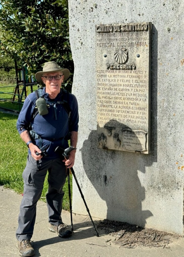Sometimes the road was rocky. Today that is a good thing, because it also means dry and firm footing. Here is Ron taking a photo of a waymarker that has the kilometers to go on it.