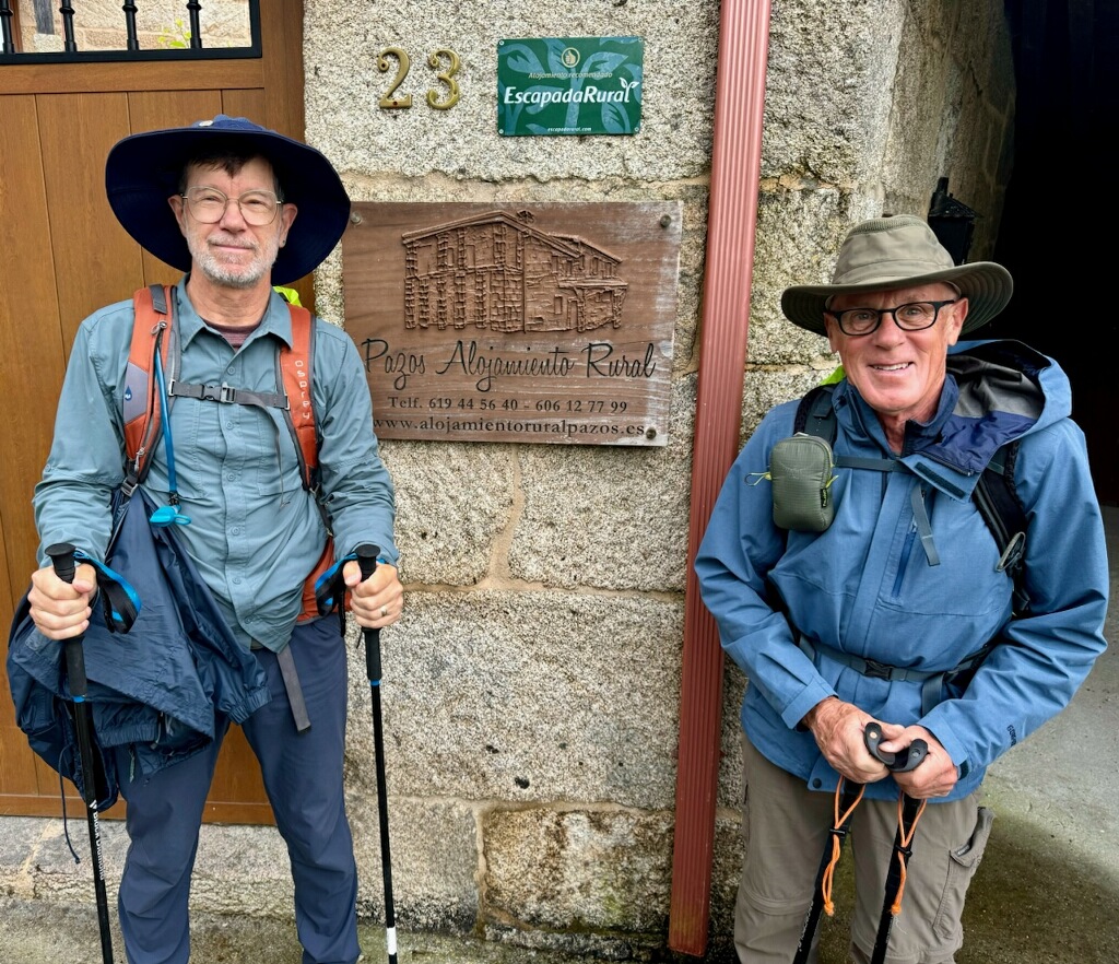 Dan and I started early at about 8:20. Ron is making it a shorter day by sharing a taxi to Castro Dozon with two ladies who were in the same accommodation. That will allow him to reduce the walk to about 12 kilometers to spare the toll on his knee. Ron saw us off and took a photo of Dan and me as we were leaving Pazos Alojamiento Rural for our walk expected to be over 30 kilometers.
