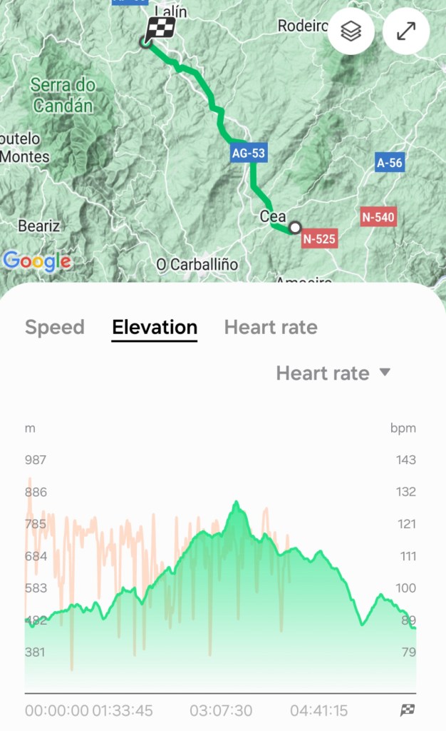 From the map, it can be seen that we are on a generally northwest course to Santiago de Compostela. The profile graph shows that we basically went up and over a mountain and then back down to our end point of Estación de Lalín.