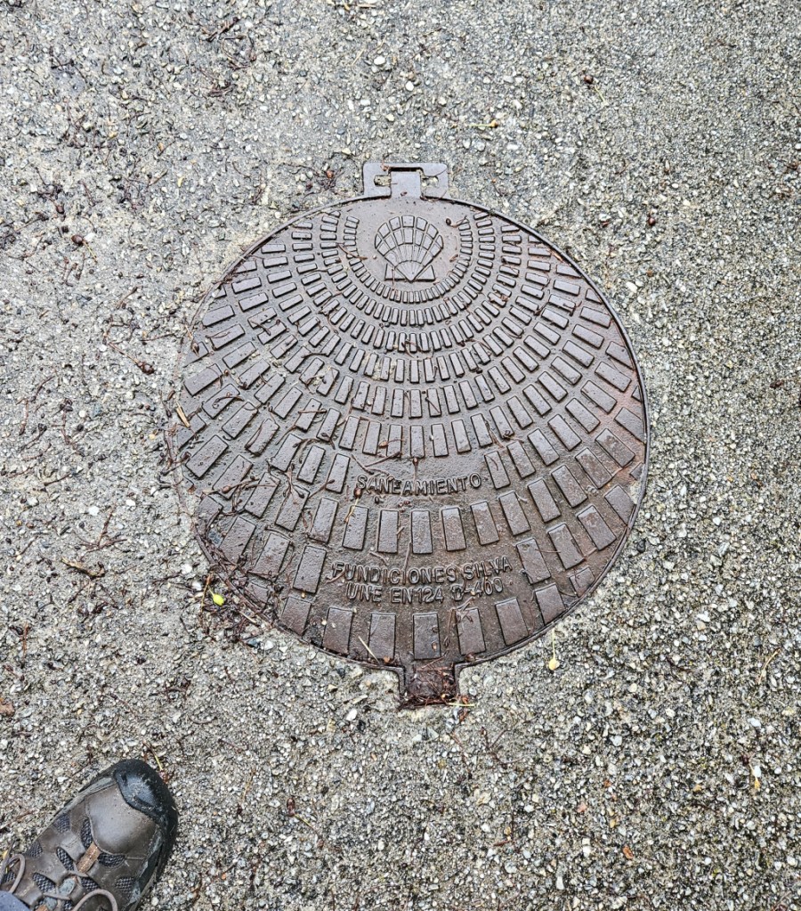 We got through this part of the natural path, crossed a paved road, and noticed this manhole cover with the Camino shell, and the whole cover styled like a shell. Very nice! (You can also see my very wet foot in the lower left of the picture.)