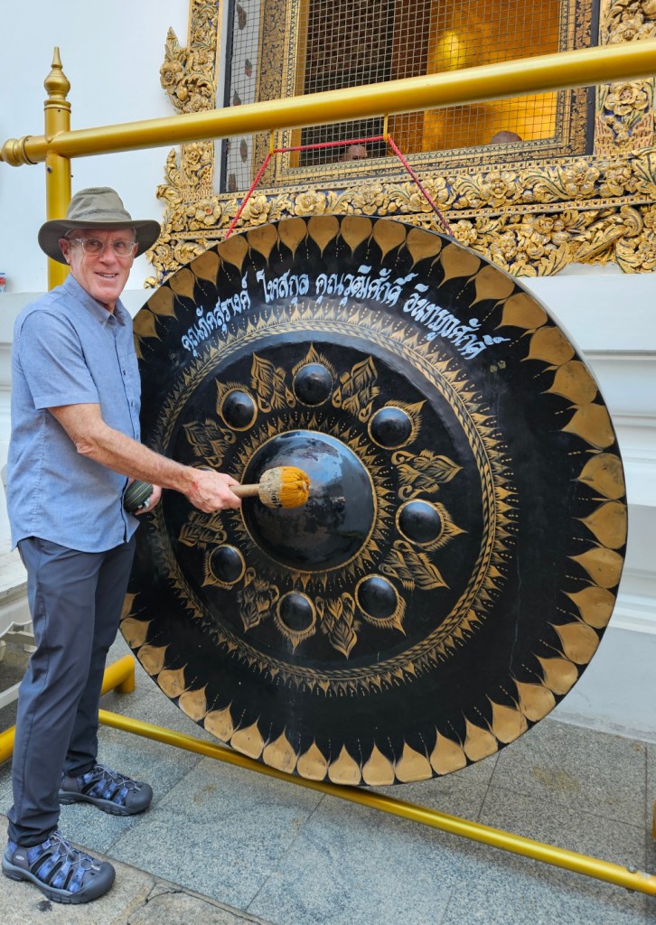 Before I got into the pavilion of the Reclining Buddha, there was a gong I wanted to strike, so another tourist took a photo of me at the gong.