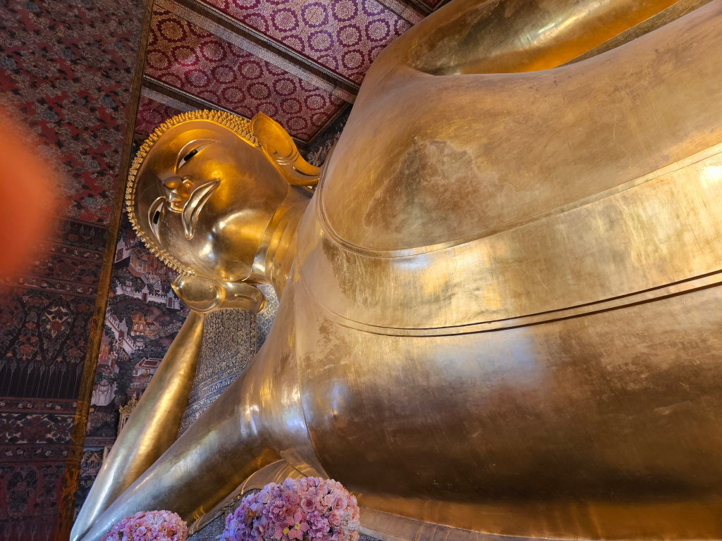 Wat Pho is known as the Temple of the Reclining Buddha, and its official name is Wat Phra Chetuphon Vimolmangklararm Rajwaramahaviharn. Wat Pho is first on the list of ten temples in Thailand classed as royal temples of the first class. Wat Pho was built under the reign of King Rama I in the early 1800s. The most significant feature (and tourist draw) is the large Reclining Buddha, a 46 meter-long (155 feet) reclining Buddha statue. Wat Pho is considered the oldest center for public education in Thailand, also houses a school of Thai medicine, and is regarded as the birthplace of traditional Thai massage which is still taught. A welcome garden seems to be new since last year.