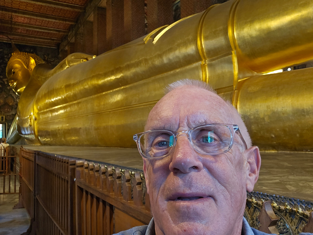 Every time I have been at Wat Pho, there are many, many tourists, but I still love standing near the large reclining Buddha statue and taking in the history, the relevance, and the beauty of this relic. It is difficult to get a good picture, because of the structure’s support columns, but here are a few photos. A note – I seem to have very little or no skill for taking “selfies” but I’ll keep trying, if only to prove that I really am in the places I photograph.