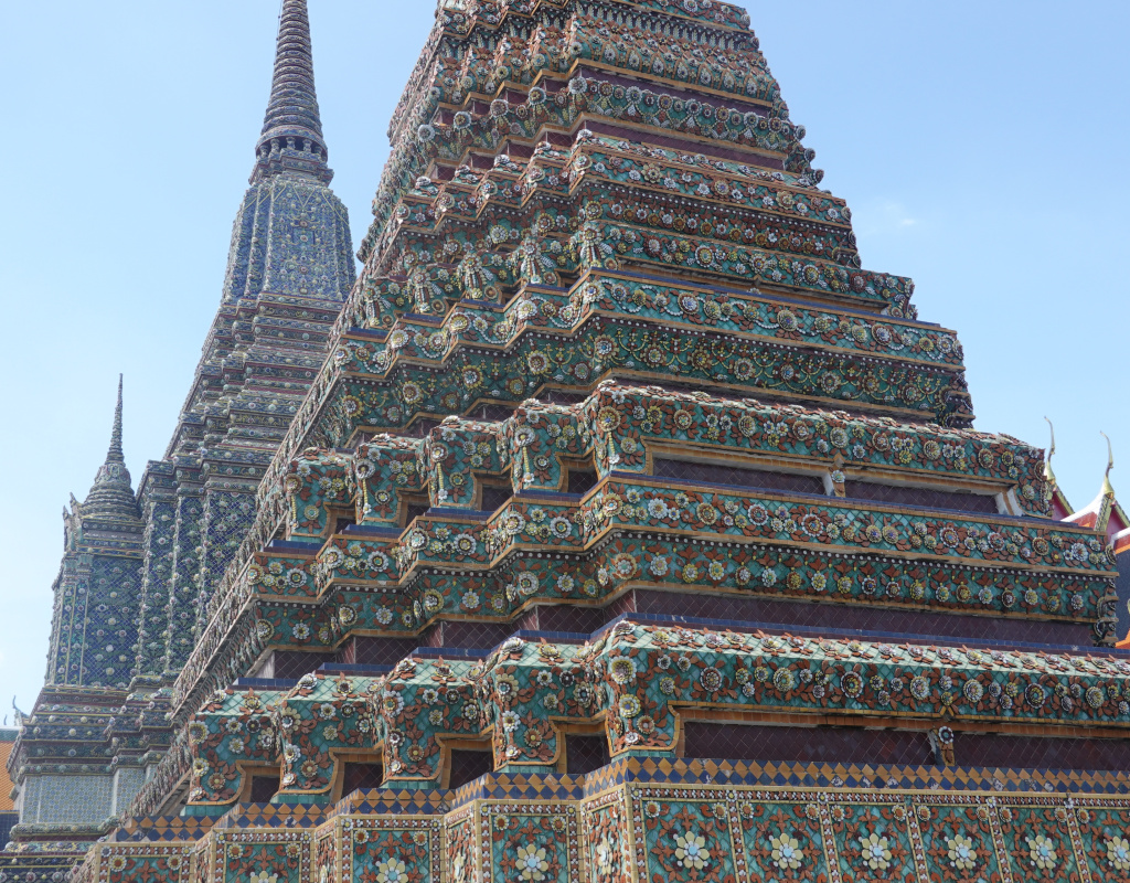 Wat Pho is a fairly large campus. There is far more than the pavilion housing the Reclining Buddha. I have explored and photographed many buildings here in the past. I want to move along to two more temples, so I only took this picture of a couple of structures that are finished similarly to the towers at Wat Arun.