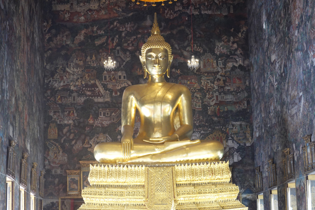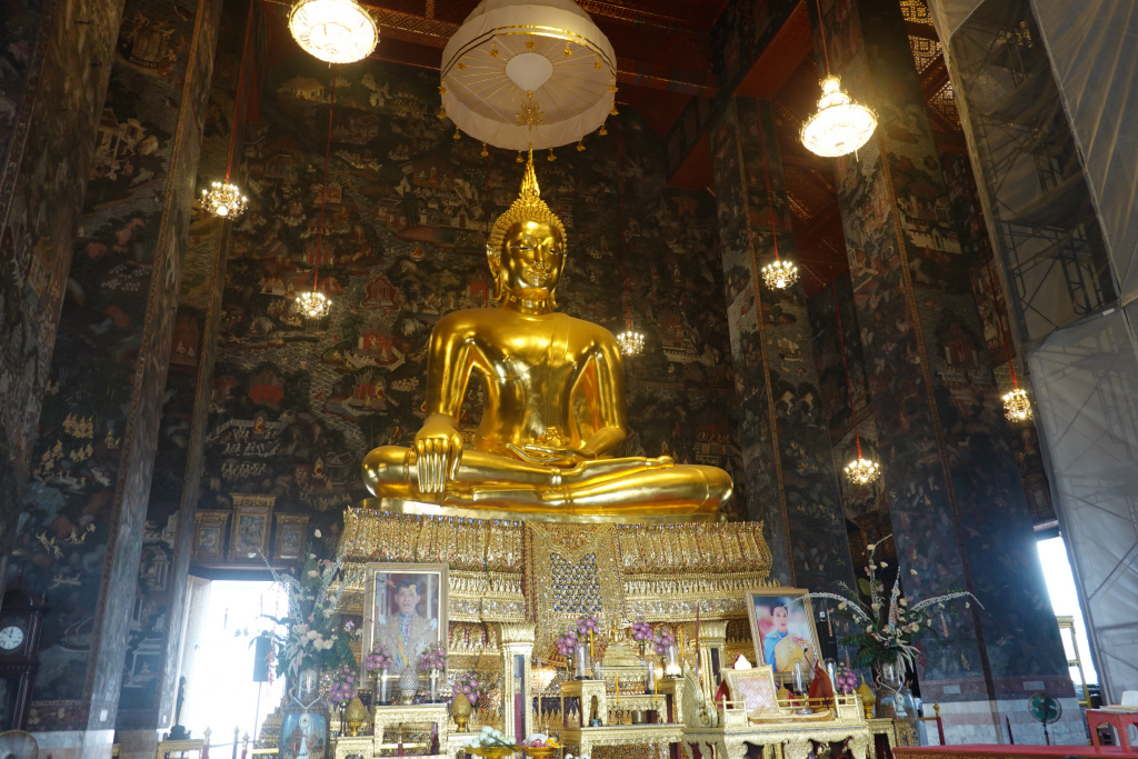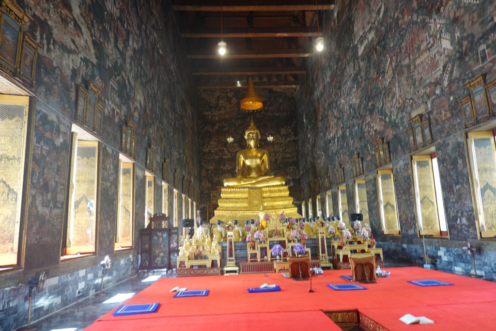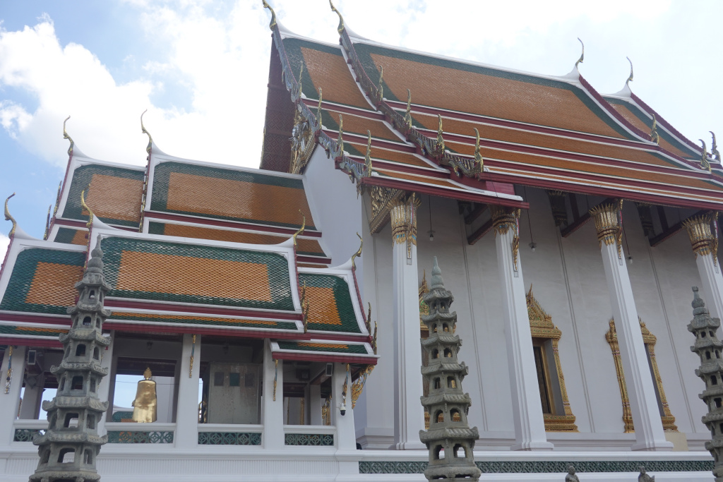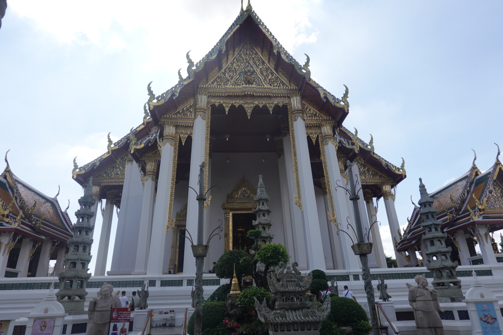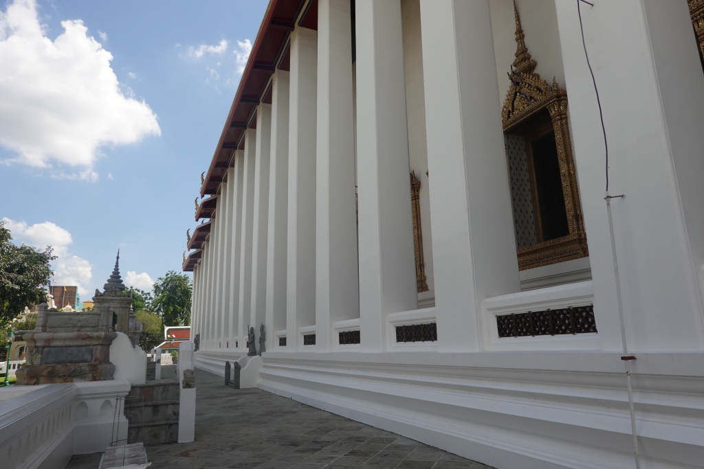 When looking at the list of Thai royal temples of the first class in Bangkok (a short list of ten), I noticed Wat Suthat and realized (1) I had never been there, and (2) it was not terribly far from Wat Pho. Being a Royal Temple of the First Class, my interest was peaked. I learned that the construction of Wat Suthat Thepwararam was begun by King Rama I in 1807. In the beginning, it was called “Wat Maha Sutthawat.” Further construction and decorations were carried out by King Rama II, but the temple was not completed until the reign of King Rama III in 1848. So headed out on a 1.5-kilometer walk to find this important temple.
