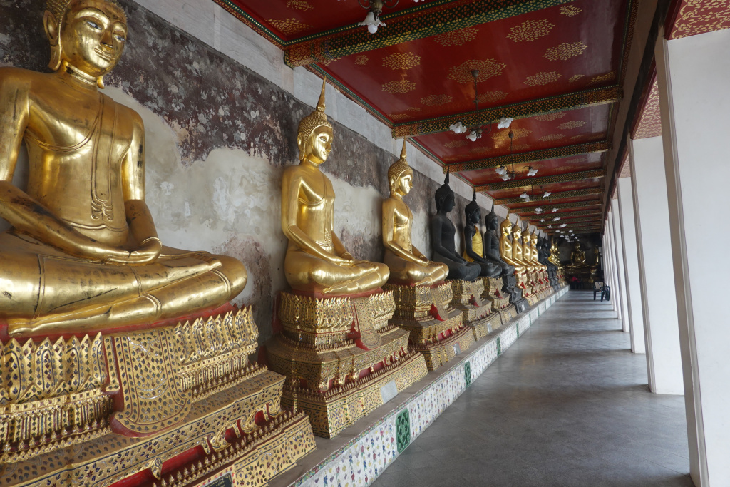 One of the most significant features of Wat Suthat is the large square cloister around the large viharn. This cloister includes over 150 Buddha statues, all seeming alike, most in gold and some in black. I could see no differences in the images and no pattern of the sporadic color change. Each of these statues has a patron who is responsible for the statue’s upkeep and many have the ashes of the patron’s relative interred under the statue. Here are two photos of opposite sides of the cloister.