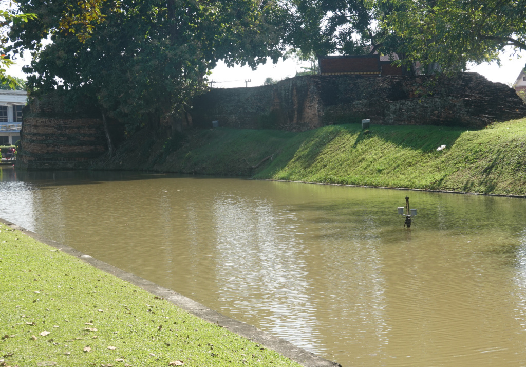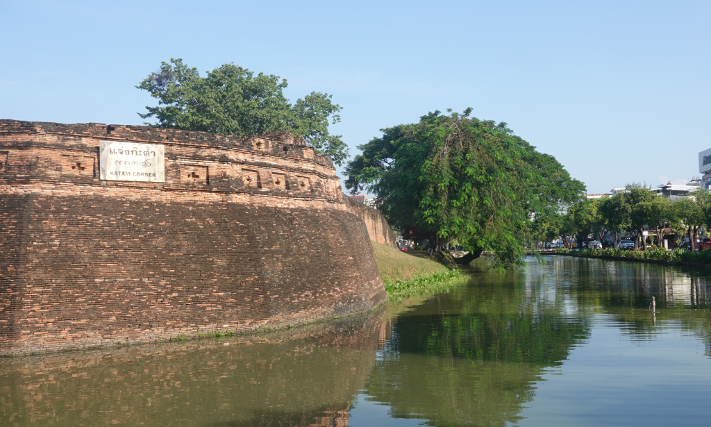 The wall is almost square, about 1600 meters on a side. In 1893, a British explorer and surveyor mapped Chiang Mai and found that although the southeast corner is off by less than 30 meters, the old city wall is remarkably close to a square considering the lack of technology available in 1296.