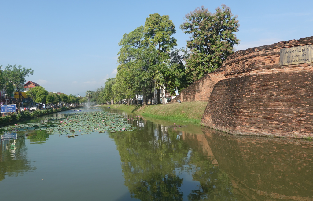 The 3-Sis guesthouse is right in the middle of the old city, just south of the N” in the map above. I made my way to a place the road crosses the moat just south of Tha Phae Gate and walked south, on my way to Katam Corner.