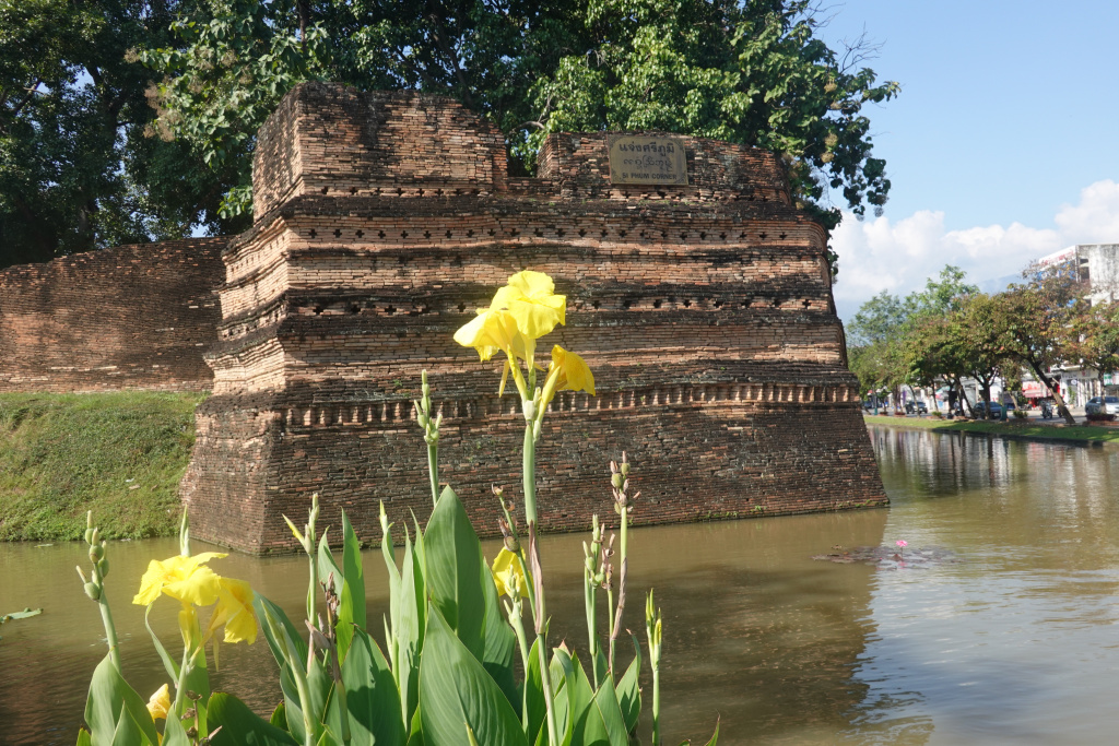 In the middle of the north side of the wall/moat is Chang Phuak Gate. About two years ago after extended heavy rains, part of Chang Phuak Gate collapsed. In the process of starting to rebuild the structure, other archeologically significant structures were found. It is unclear what the plans are for this gate. The road has been closed to traffic and a bridge for pedestrians added for people to cross.