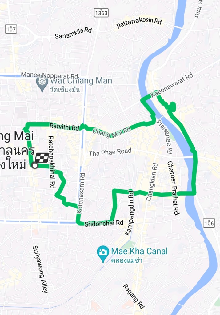 Being close to “home,” I made my way up Loi Kroh, then Sridonchai and into the old city and back to The 3-Sis. The walk was good, about 7.14 kilometers (4.44 miles) at a decent pace, considering I stopped often.