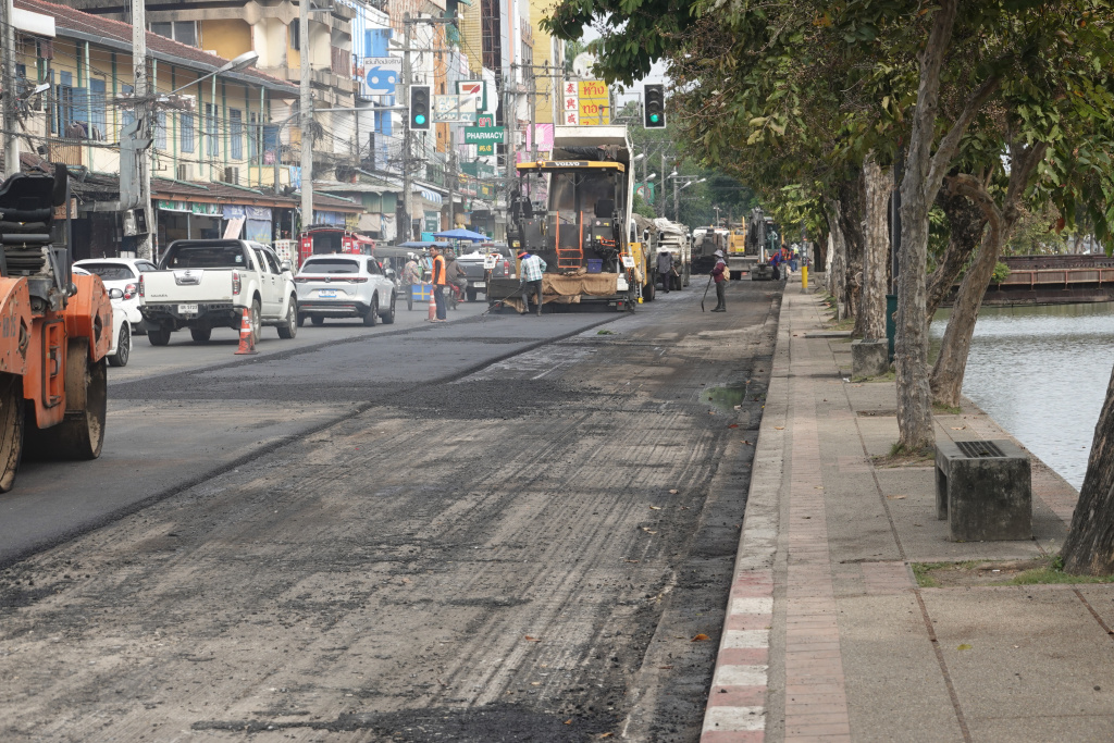 From the Three Kings monument, I walked east to the moat. As I crossed the inner moat road, I saw repaving underway. Almost two years ago, a lengthy project started to put all of the power and communication cables in the old city underground. This involved many streets being dug up, cables and conduits laid, buried, and then the road patched. The result is that many of the roads are quite bumpy. I noticed this while I was in an Airport Taxi the evening I arrived; the drive along part of the moat was quite jarring. So part of the project is to re-pave the roads. Instead of laying new asphalt over the roads, they are digging up the old asphalt to a depth of about 8 cm (3 inches) and recycling the old asphalt. I saw part of the project in progress on the inner moat road just north of Tha Phae Gate: