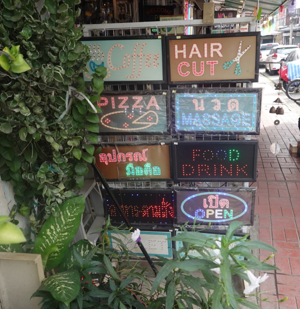 I headed east down Chang Moi Road towards Warorot Market by the Ping River. Along the way I passed a shop selling lights, light bulbs of all kinds, and electric signs. I have seen this before and always get a little kick out of it. If I started a coffee shop, barber shop, or massage shop, I know where I can get a sign.