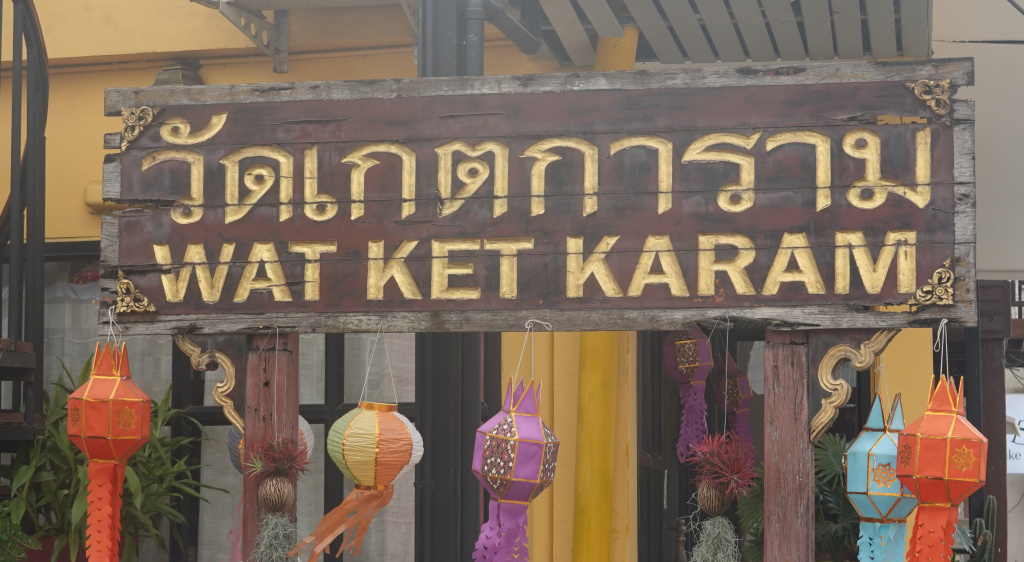 Just down the street is one of my favorite temples, Wat Ket Karam. The name is one of the examples where the actual sound cannot be depicted accurately in English. The Thai language has 44 constants and 22 vowel forms, so some of the sounds can be challenging to write in English. At Wat Ket Karam, there are three signs with English, Wat Ket Karam, Wat Kate Karam, and Wat Gate Karam. The sound is not “kuh” or “guh”, it is a sound in between those sounds. Nevertheless, I like this temple. The entrance sign: