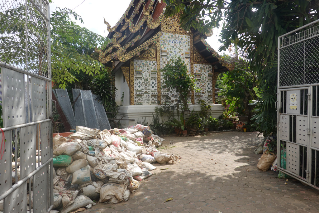 Entering here the piles of sandbags are still at the back of the viharn (worship hall). Also, the old wooden museum was flooded, severely damaged, and had to be demolished. It seems to be under reconstruction behind the fencing to the left of the viharn.