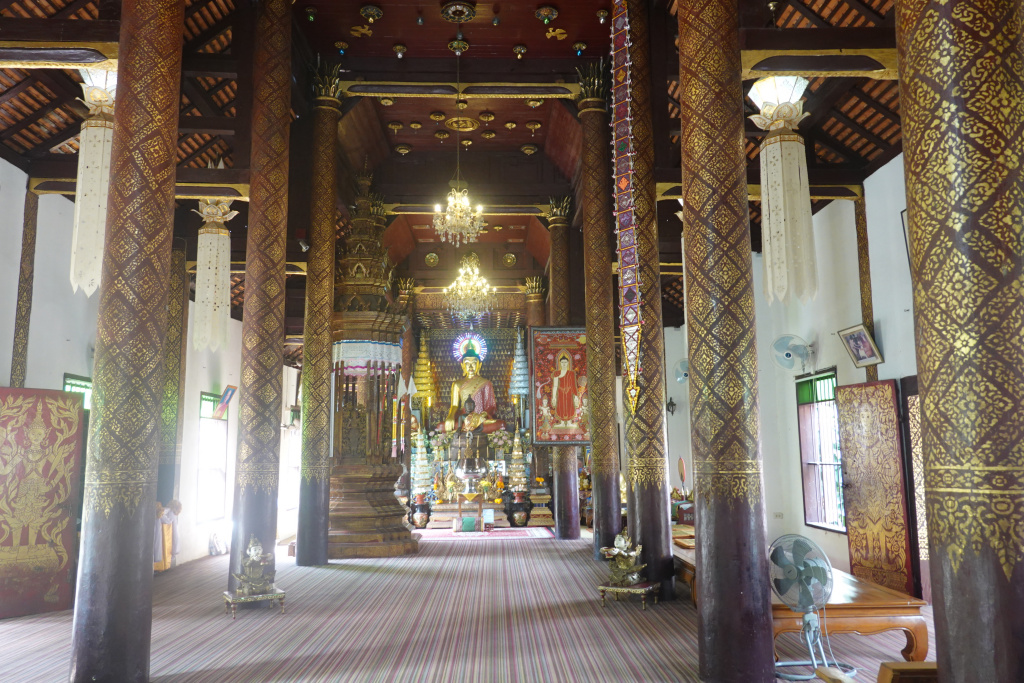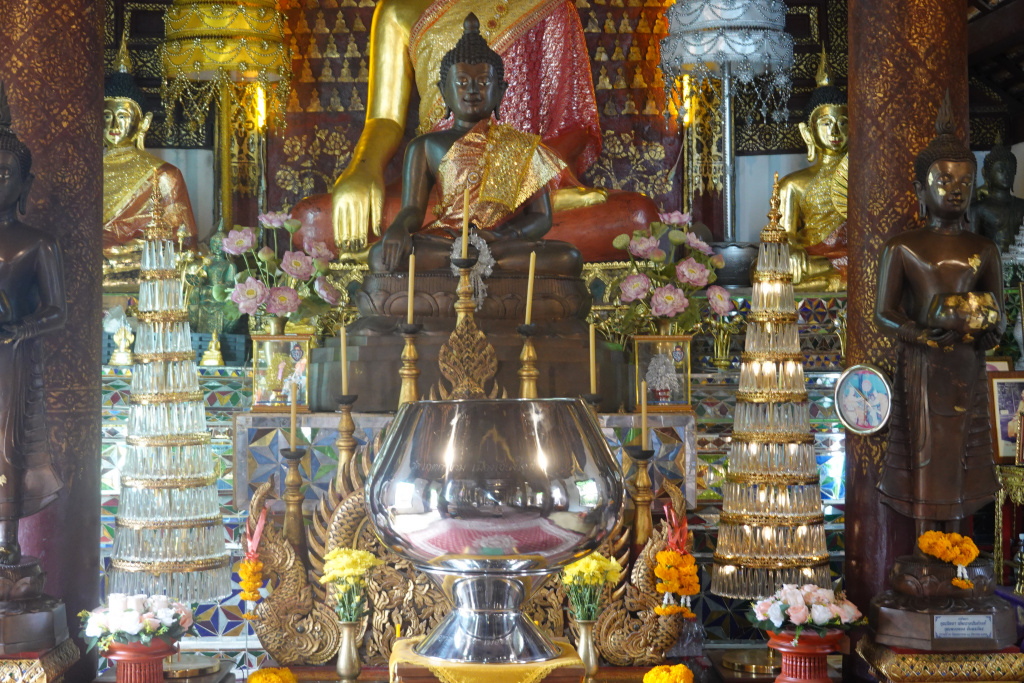 The inside of the viharn has been a favorite of mine. It is not large, but is all teak and has a nice quiet, reflective ambience. The unfortunate change is the LED colored lights over the larger gold Buddha head. Looks too garish and not at all what I liked about this temple. So the second photo is of the smaller, more appealing (to me) Buddha statue.
