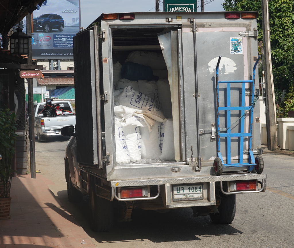 Walking south along the river past several restaurants, I saw the same ice truck and young men who deliver ice to The 3-Sis every morning while I am at breakfast. They recognized me and made a small wave. Almost all restaurants get their ice delivered from a few places where the ice is made using filtered, purified water. Thus while I am a little reluctant to drink the tap water, the ice in drinks is considered safe. A shot of the back of the ice delivery truck. I think each bag of ice is 35 kilograms (77 pounds).