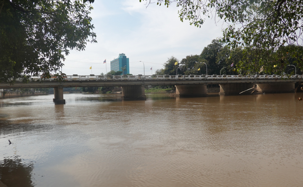 I crossed over the intersection at the Narawat Bridge and along a section of the Chiang Mai-Lampun Road where the floodwater had been at least chest-deep. This section has been cleaned so well that it is as if no flood has occurred. Here is a view of the river from just north of the Iron Bridge (Saphan Khua Lek). I have been here many times. While not nearly at flood levels, the water is higher than normal: