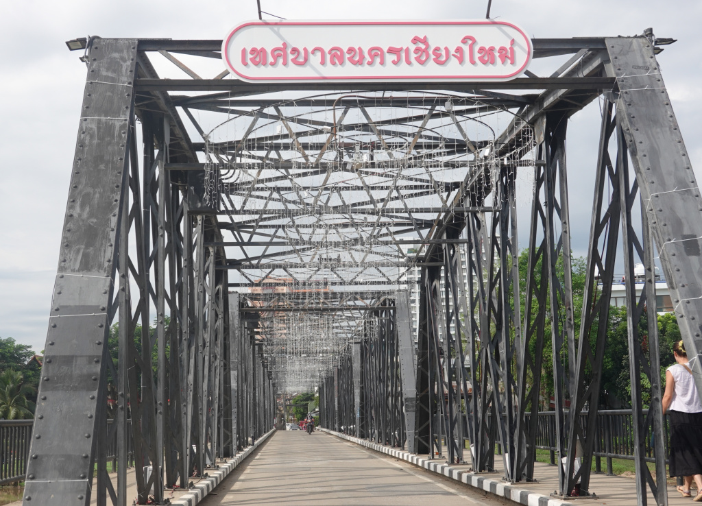And a view of the decorations on the bridge – the Iron Bridge is always decorated for the holidays, Loy Kratong (two weeks ago) and Christmas/New Year. I’ll have to get a photo of this at night when it is lit. Traffic is one-way on the Iron Bridge with pedestrian walkways on both sides. Traffic was very light today, so I stepped into the road to get this photo. I highly doubt that I’ll be so lucky in the evening. The sign at the top translates to “Chiang Mai Municipality” and there are strings of lights hanging down all along the bridge.