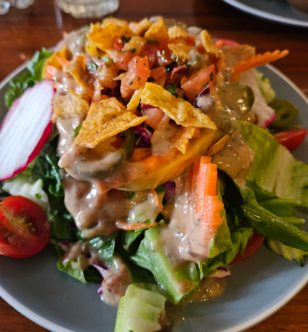 Another favorite place for foreigner-style food is The Dukes. The Dukes has been by the Mae Ping River for more than 25 years. Their motto is “No claims… no games… just great food in Chiang Mai.” The things people often get there are steaks, ribs, burgers, pizza, and salads. All of their sauces are made fresh every day. I went there after a hike and was there in time for the pre-6 PM specials. One caught my eye, the pork tacos with a Mexican salad, so I ordered it, and as is everything at The Dukes, it was very tasty! Aloy Maak! or อร่อยมาก as would be said in Thai (“aloy” means “tasty” and “maak” means “very”).