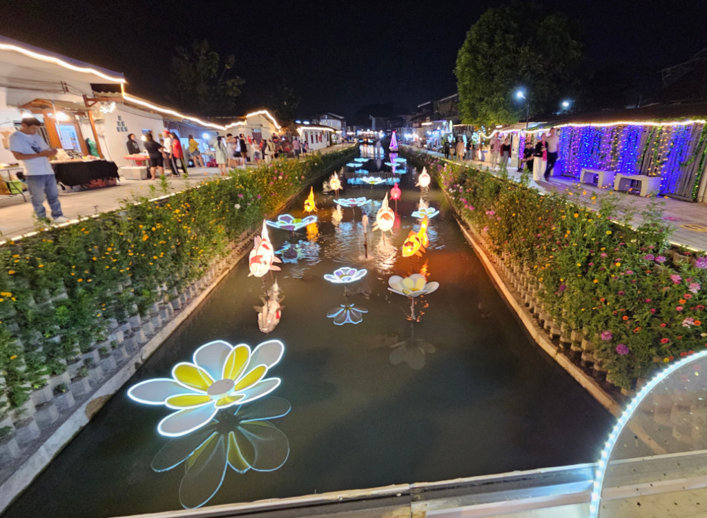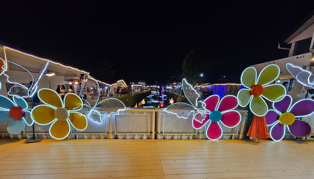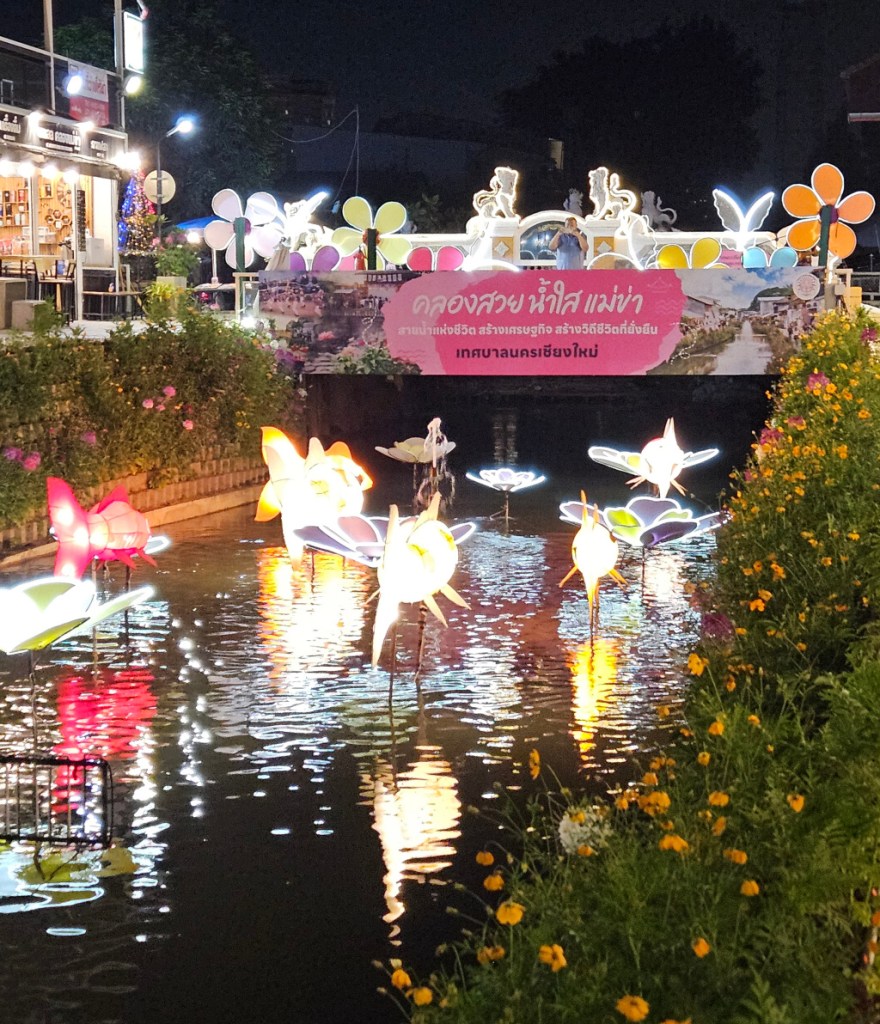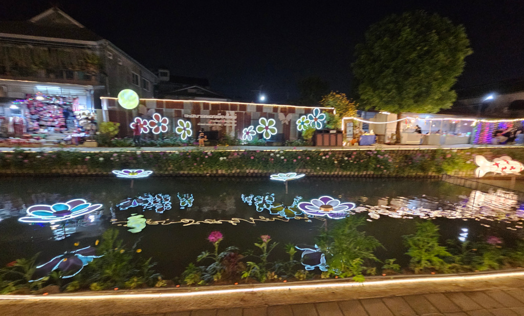The part of the Klong Mae Kha from Ragang Road south about 200-250 meters was improved about 3 or 4 years ago. The channel was deepened to improve flow, sidewalks made along the sides, and crossover bridges added. The people living by the klong started opening small shops selling crafts, souveniers, and food. Soon, the Klong Mae Kha became a very trendy place for photos for social media. Even today, many people visit, especially at night when the decorations are lit. So I went there at night to check it out and found many people and a festive atmosphere. Here are a few photos. First, at the bridge at Ragang Road, then looking down the klong from the bridge.