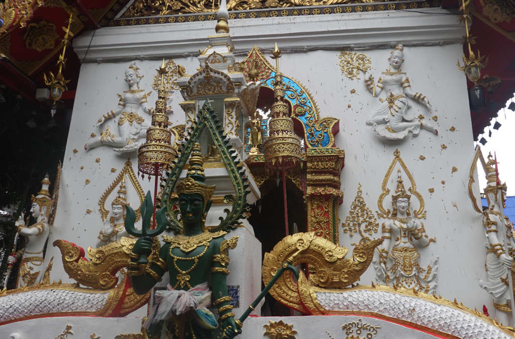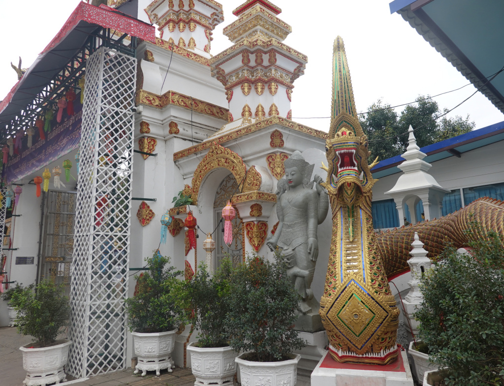 In back of the viharn and the all-white chedi is the ubosot (ordination hall) with a very colorful front. I have never seen the ubosot open, but inside are the 1000 Buddha images. I have often said that the northern-Thai temples are more exuberant in their artistry than the central-Thai temples (Bangkok); this is an example.