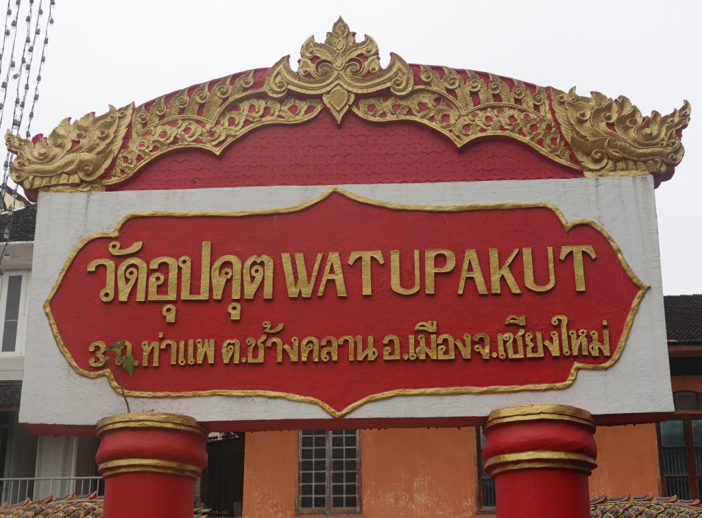 Heading east along Tha Phae Road, and just before the Nawarat Bridge over the Mae Ping River, I passed Wat Upakut (sometimes spelled Wat Upakhut). This is often called the “temple with 1000 Buddhas.” The small Buddha images are in a building that always seems to be closed when I visit, so I have yet to see the 1000 Buddhas. Wat Upkut is always very busy. It is said to have been larger but lost some of its grounds and buildings when the Puttasatharn Buddhist complex was built next door. The grounds and buildings are always in good shape and over all the years I have visited (albeit infrequently), it has never seemed to be in need of cleaning or renovation. It is difficult to get a good photo of the entrance without being in the middle of a very busy four or five-lane road (“lanes” are an ambiguous concept, just as sidewalks are in Thailand). Here is a photo angled to the Naga-guarded entrance and then of the entrance sign itself.