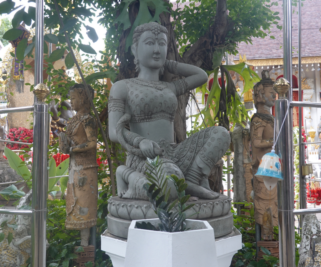 Towards the ubosot there is a very nice all-gray depiction of Phra Mae Thorani, or what is often called “mother earth.” Phra Mae Thorani is personified as a young woman wringing the cool waters of detachment out of her hair to drown Mara, the demon sent to tempt Gautama Buddha as he meditated under the Bodhi Tree.