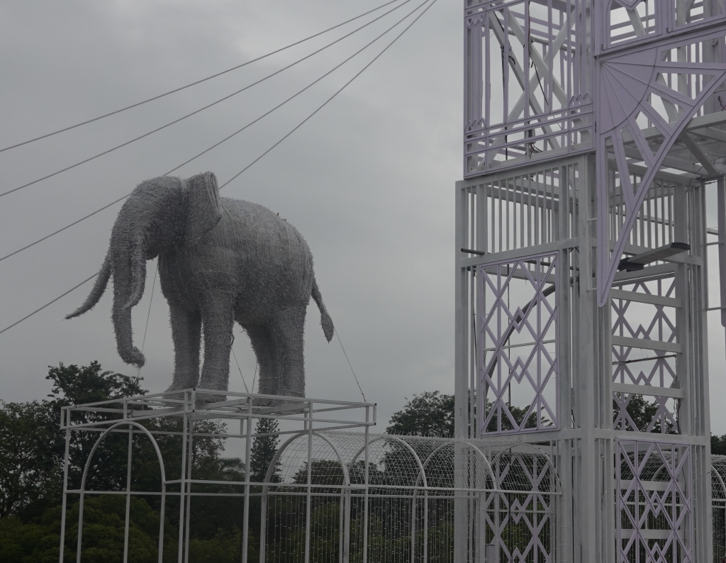 Since early December, a fairly massive structure has been placed on the bridge for the decorations for the 2025 New Year’s Countdown. Here are a couple of photos from the daytime. And those elephants are close to full size, covered in pink and blue lights.
