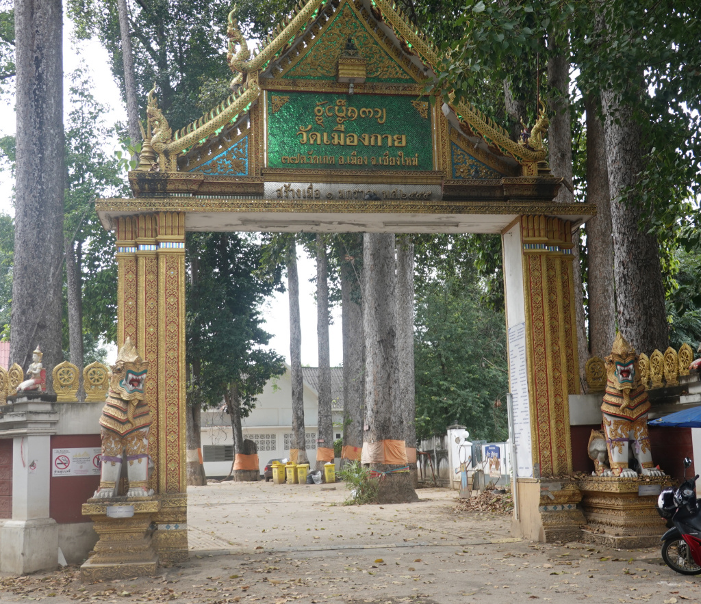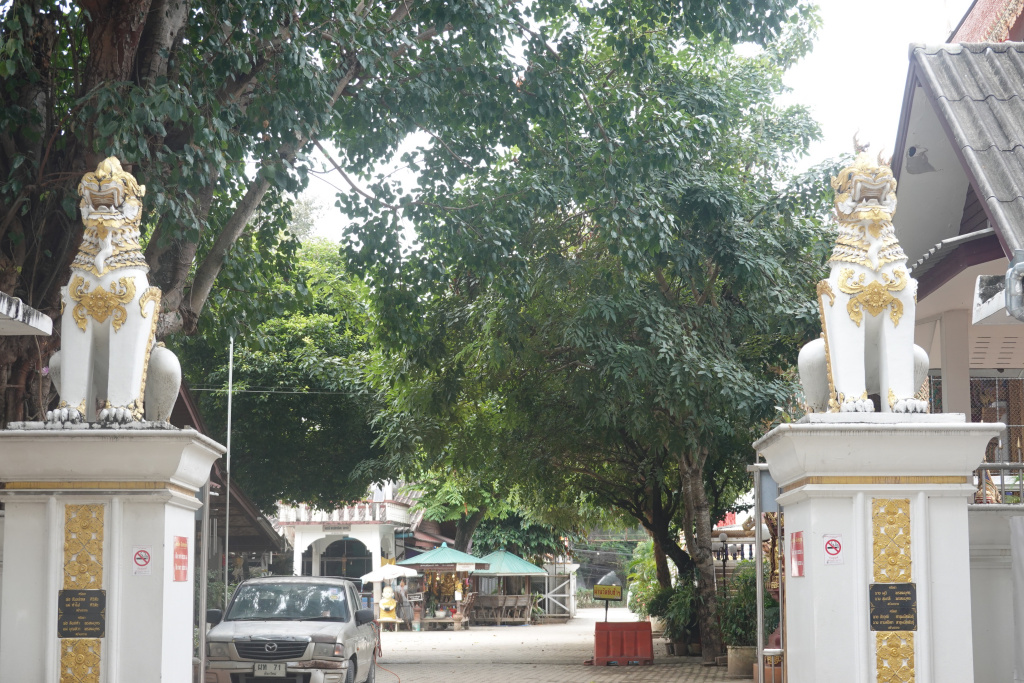 I arrived at Wat Mueang Kai, a local temple on a fairly large plot of land. There are two entrances, one from the road to an area where cars park, and a second into the temple itself. The car park area is lined with very tall trees making for a peaceful setting. Both entrances are guarded by Singha lion-like creatures