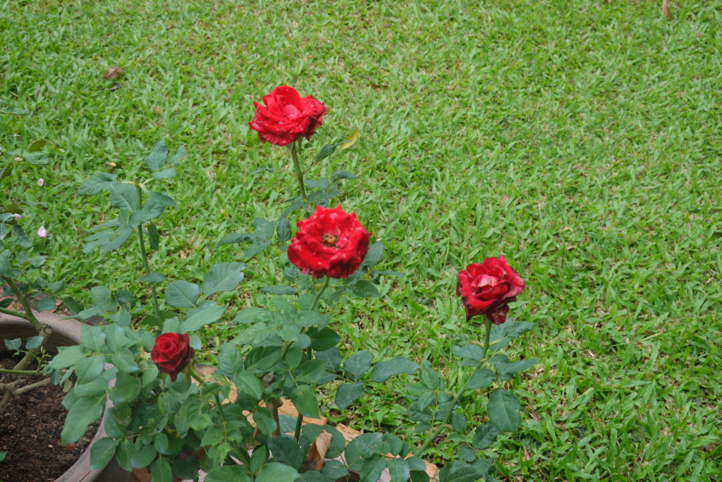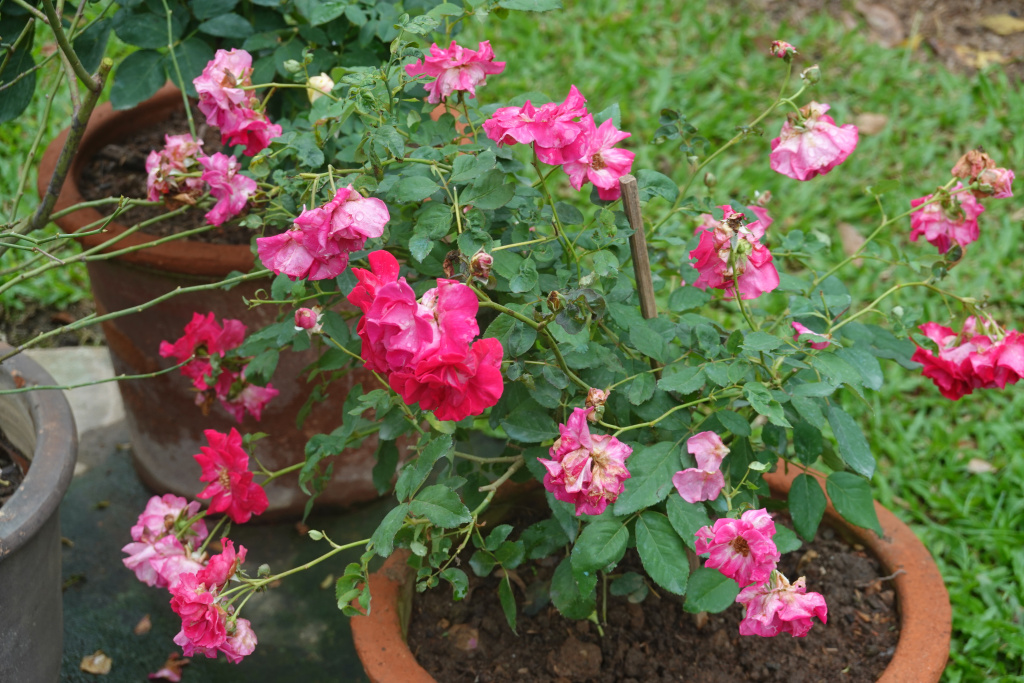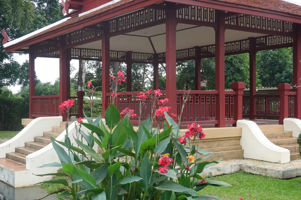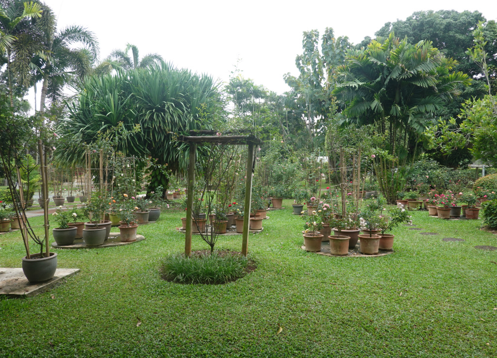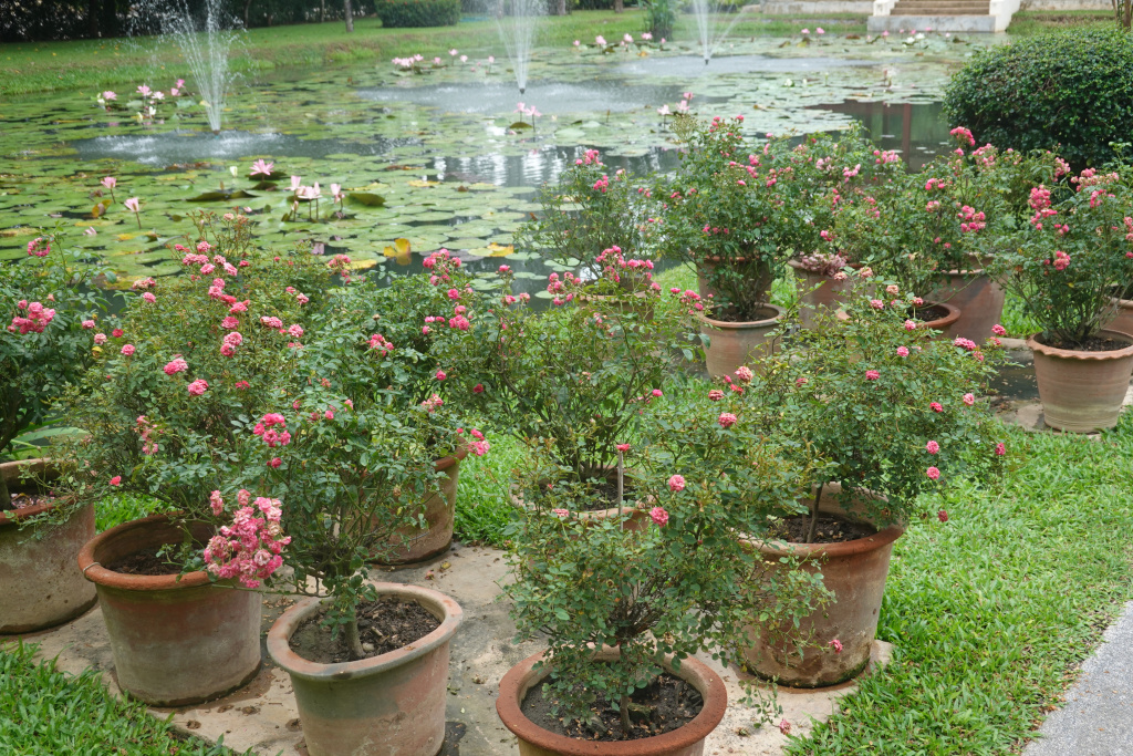 When I arrived, it was lunchtime and the museum was closed. This gave me time to wander through the gardens and photograph the flowers. The garden features roses sent to the princess by The Royal National Rose Society (RNSS), including a large, fragrant, showy pink rose which she named “Chulalongkorn” in honor of the King. Surprisingly, the roses are all in pots, possibly to keep out pests or provide better soil conditions.