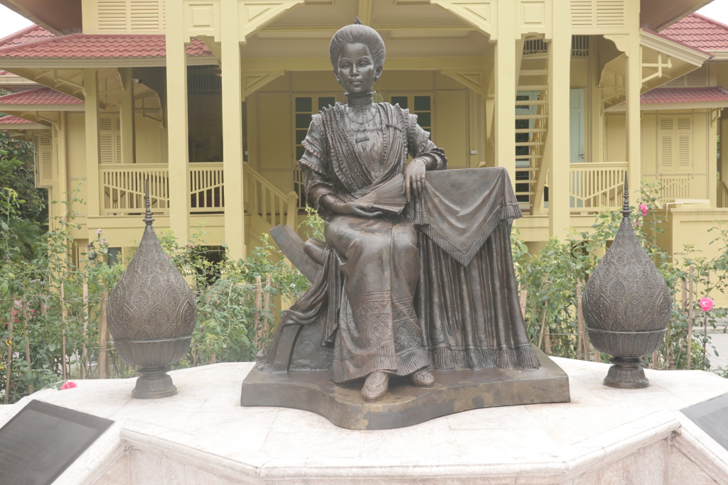 With the house in the background, a statue of Princess Dararasmi on display with white wild roses behind her.