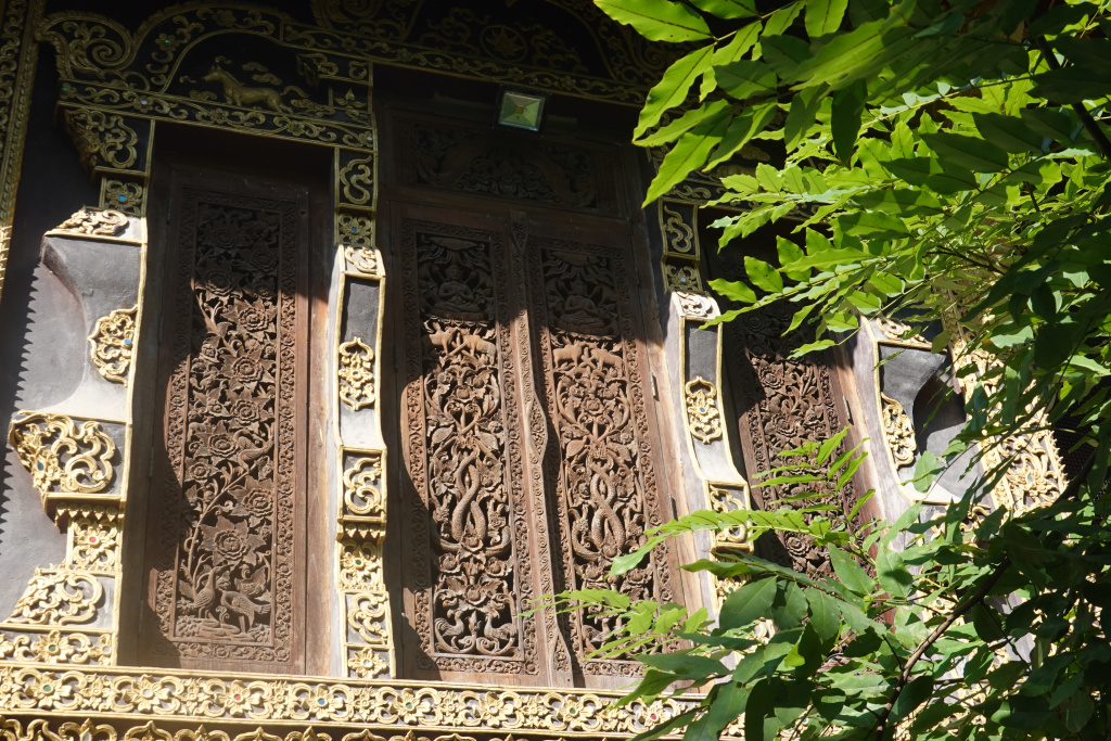 I noticed and immediately liked a notable feature of the viharn, the intricately carved window coverings.