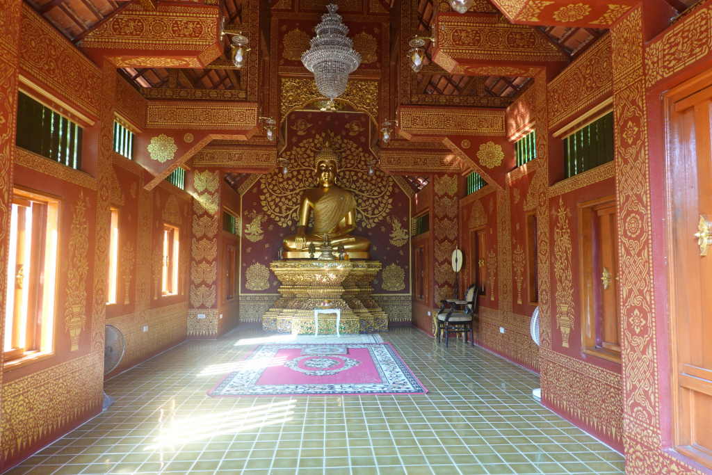 The ubosot is very nicely decorated, and very definitely in the Lanna style, with tiered, overlapping roof sections sweeping low at the sides, and the front entrance stairs guarded by the fierce naga creatures. The inside of the ubosot is very plain, simply decorated.