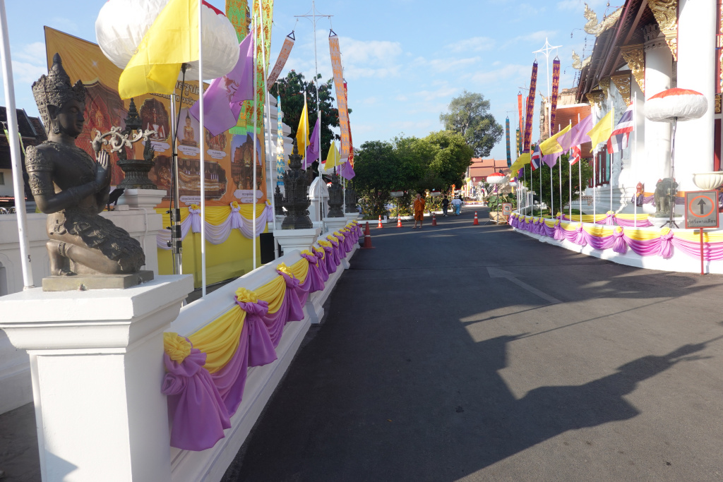 I have visited and written about Wat Chedi Luang many, many times over the years. In many ways, it is my favorite temple. I used to sit at the base of the large chedi every morning for a short meditation. [I stopped when they started charging foreigners 50 baht to enter the temple grounds.] The King of Thailand, Vajiralongkorn or King Rama X, the tenth monarch of the Chakri dynasty, is visiting Wat Phra Singh and Wat Chedi Luang tomorrow in a short visit to Chiang Mai. The temple and others nearby are cleaned and decorated for the King’s visit.