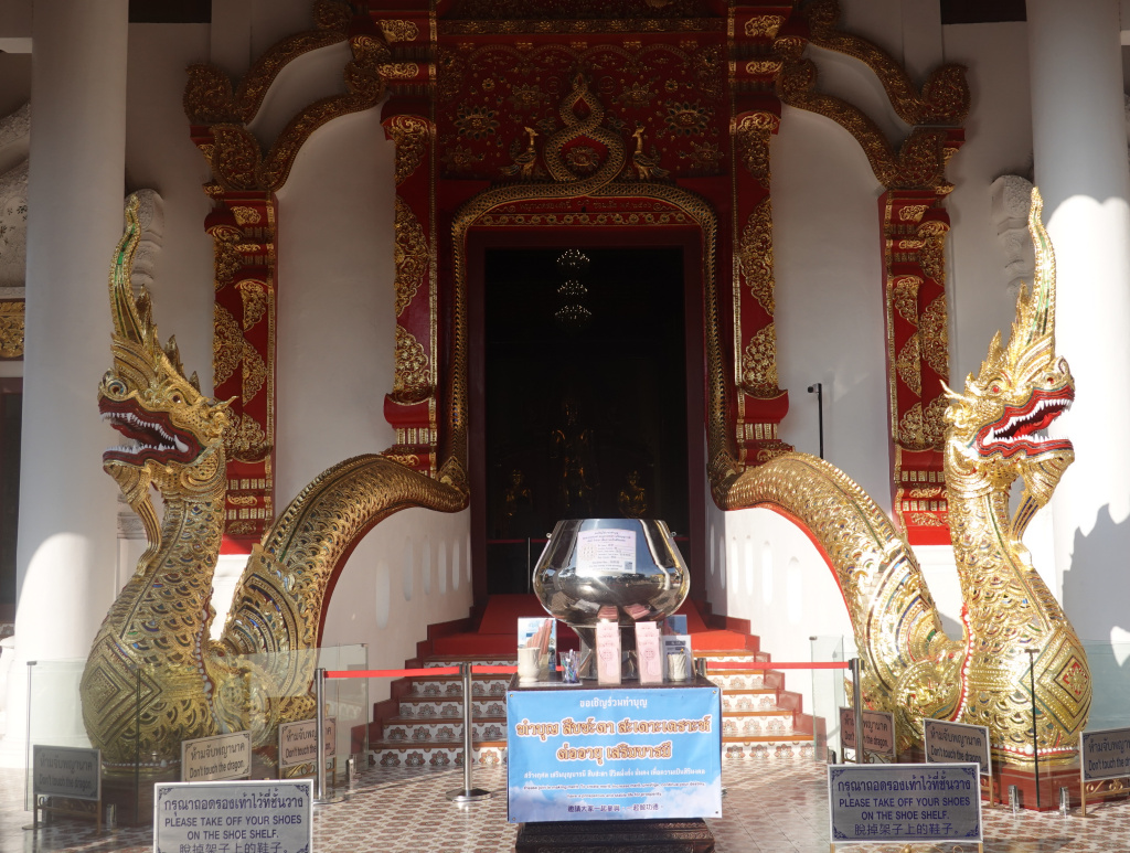 Looking directly to the viharn from the main temple entrance the decorations are clear. Closer to the entrance to the viharn, the only change I noticed was a large donation urn and the viharn is closed, blocked off by a red barrier.