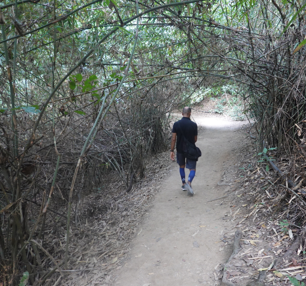 In a few places, the bamboo has fallen across the trail, making almost a tunnel through the bamboo, another natural, not very difficult challenge. In this photo, we can easily walk through, but in some places, the top is just over waist-high and much slower to negotiate.