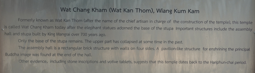 The second site we visited was Wat Chang Kham, formerly known as Wat Kan Thom. It is called Wat Chang Kham today because of the elephant statues at the base of the chedi (“chang” in Thai translates to “elephant”). I did not see the elephant statues among the ruins.