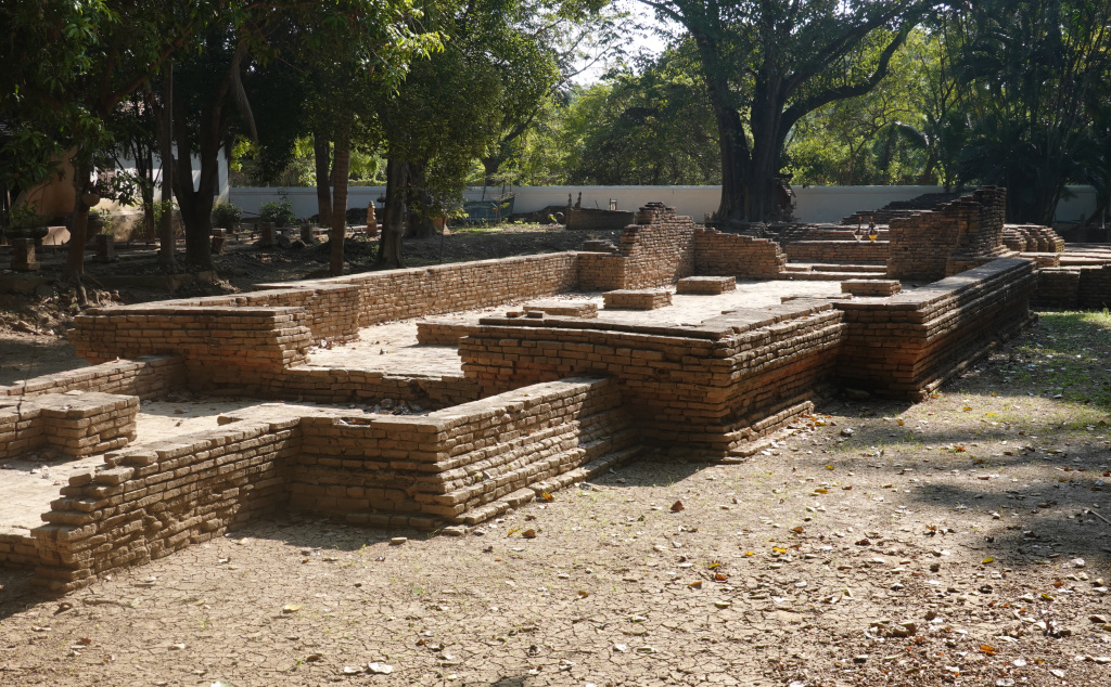 This is a small excavation site, with essentially only one structure uncovered, the foundation and base of a viharn (assembly hall) and a smaller foundation of what might have been a chedi. Here are two photos of the site of the former Wat Chang Kham temple: